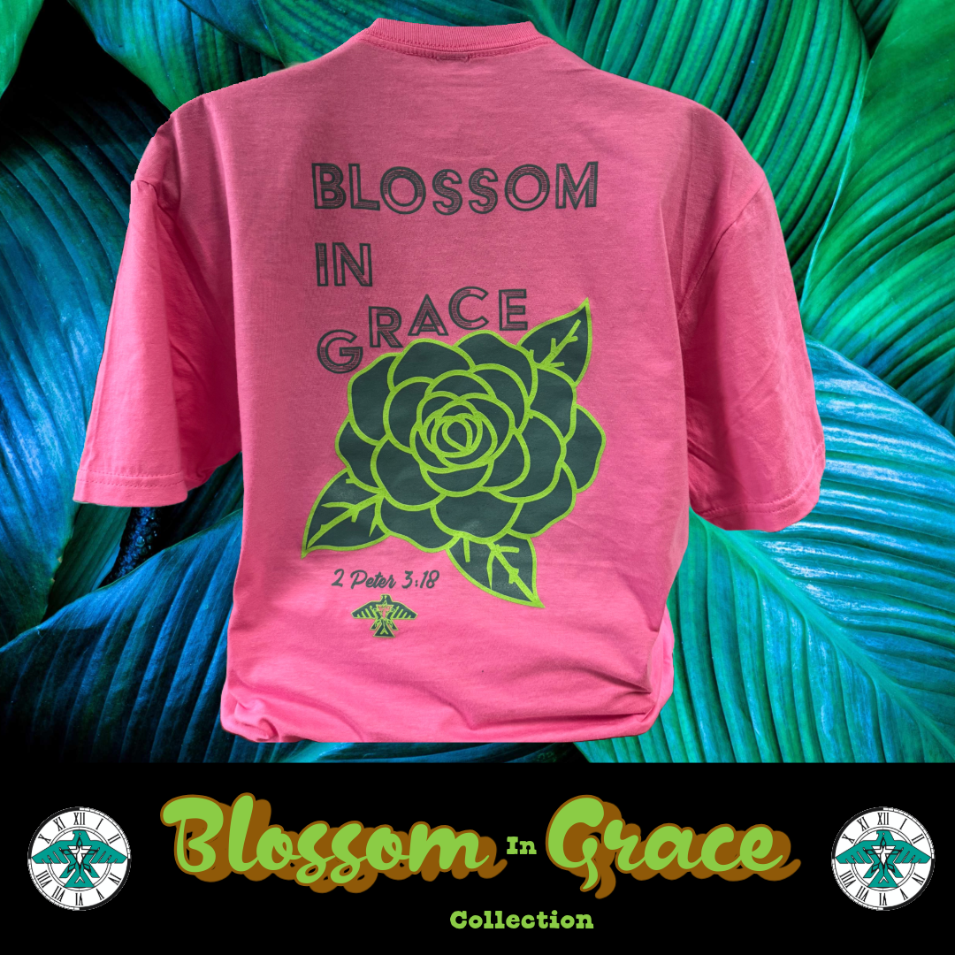 Step into your season of growth with the Blossom in Grace Tee, part of the exclusive Blossom in Grace Collection. Featuring a bold camellia design and the empowering message “Blossom in Grace,” this tee is rooted in the message of 2 Peter 3:18 — reminding us to grow in grace and rise in purpose.
