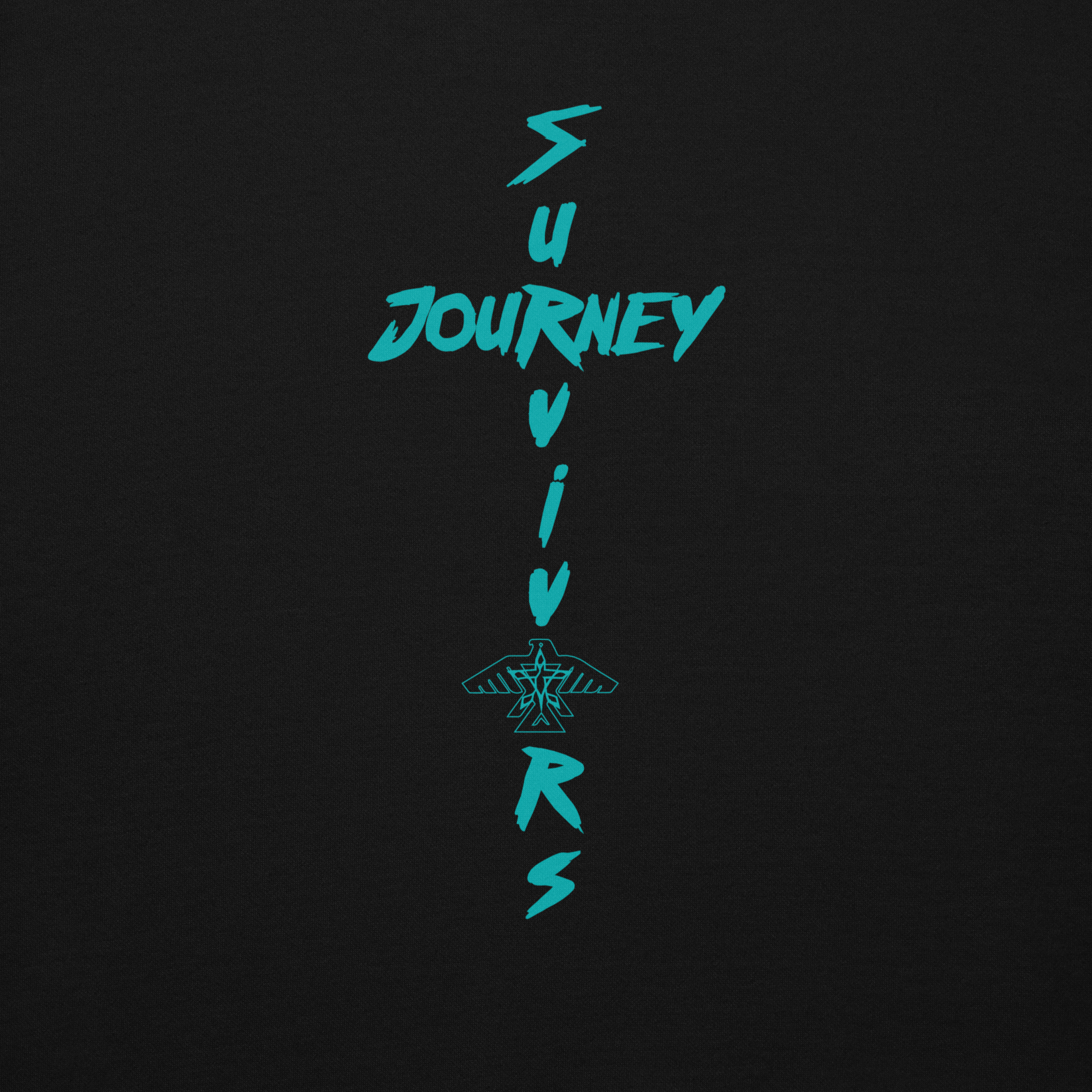 Back Vertical Cross Graphic – “Survivors Journey” arranged in a cross shape with the signature teal star, representing direction, purpose, and protection.